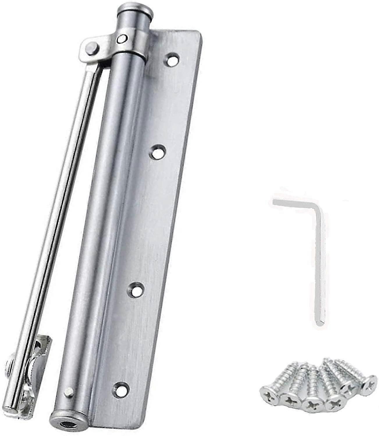 PREMIUM MATERIAL - Made of aluminum alloy, chrome, anti-rust, sturdy and durable. The bracket is made of chrome-plated plastic to avoid metal friction noise. PROTECT THE DOOR - The automatic door closer reduces the force when closing the door, protects the door from damage. Suitable for door weights of 50 80 kg, door widths of 600 1000 mm, maximum door opening angle of 185 . ADJUSTABLE - Closing speed and spring tension can be adjusted. First remove the pin, then turn the tail with a hex key and align it with the appropriate hole, then insert the pin. Can adapt to the actual needs of the door. EASY ASSEMBLY - Install the door closer between the door frames and fix it with screws. Both left and right doors can be installed. It can also be mounted on a wall. USE - Perfectly suitable for wooden doors and aluminum doors for home, office, hotel room, indoor and outdoor areas.