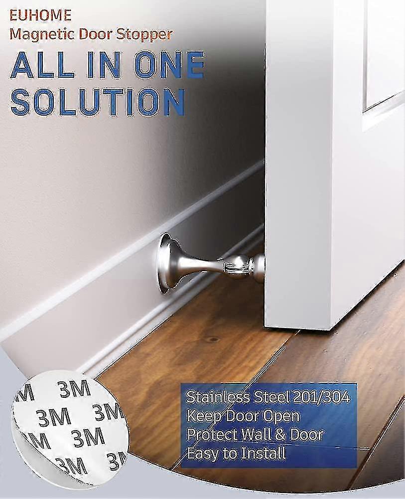DURABLE QUALITY 2 YEAR SERVICE Sturdy Rust-proof EUHOME door stopper is the best for your door and wall,magnetic door stop constructed of high-quality 201 stainless steel precise machine cutting and undergoes hundreds of scratches,corrosion and tarnishing tests,ensures optimum rust-proof efficiency,and stronger magnetic that could be possibly gained. Buy the EUHOME door stop with confidence,we will provide a 2-year service on our door stopper. Excellent quality for less money .HOLD DOOR OPEN SECURELY AND FIRMLY Effectively hold 100% of your regular interior/exterior door open with a magnetic door stop. EUHOME magnetic door stopper is a very useful magnetic door holder with a strong magnet effect,helps firmly grasp the door,and protects door and wall from slamming by wind,ensure hold your door stays open by the wind and quieter in the rest time. Your kids and pets enjoy themselves and keep away from injury by heavy slamming doors. Making your work more relax .REAL PROTECTION FOR DOORS AND WALLS Shock absorb spring helps EUHOME door stop absorb the force of slamming and minimize noise property. Door stop wall protector prevents wall scratched or impacted by doorknob. Say goodbye to be shocking closed and unsightly damaged Soft catch door holder helps in reducing startle reflex,no need to disrupt you from working. Updated hidden screw holes effectively prevent scratches caused by accidental touching and keep beauty. Great for home or studio.2 WAYS EASY TO INSTALLATION Need a door stop wall mounted or door stopper floor mounted Drilling and non-drilling installation methods are provided by EUHOME magnetic Door Stop Catch. 5*premium screws and 2*adhesive stickers included in the door stops package. Either use 3M double-sided strong adhesive,which does not require drilling,or use the screws for permanent installation. Can be installed vertically to the floor or horizontally to the baseboard or wall. Use 24 hours after pasting.WIDELY USE FOR ANY SURFACES A door stop can be attached to varieties of smooth surfaces. Wood,glass,metal,marble walls,composite material,etc. Whether quiet study,wet bathroom,or a drafty hallway looking for a solution to hold the door open,you can count on EUHOME door catch. You wont have to wrestle with to get it where they need to attach. Note: double-sided adhesive tapes do not suit paint walls,wallpapers,and uneven surfaces,please you can install them permanently using screws.
