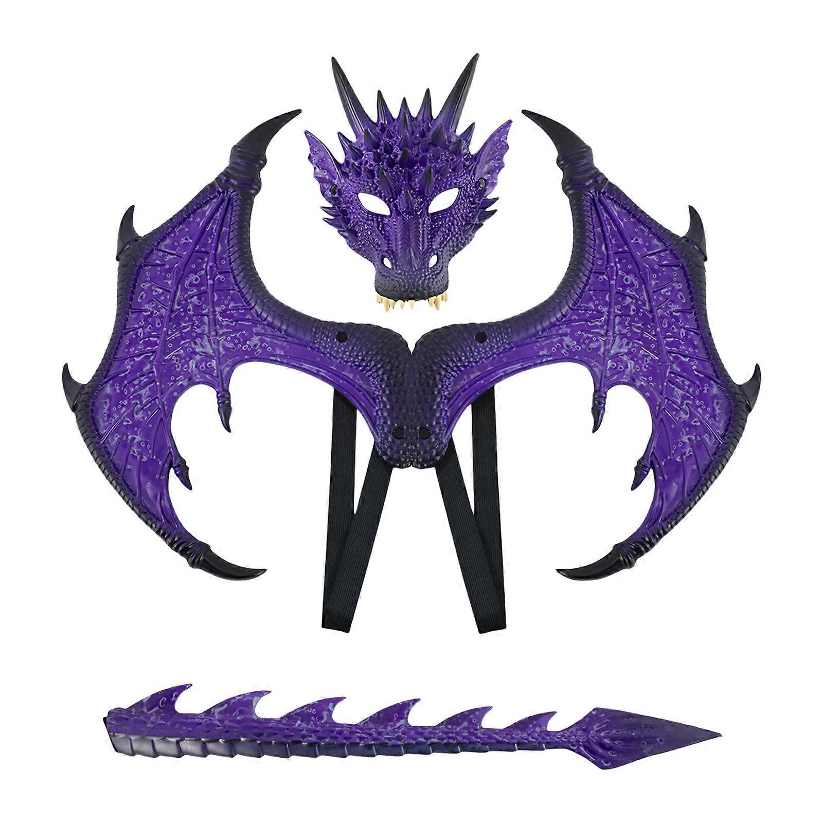 Dragon Wing Tail and Mask Set Halloween Dragon Costume with Elasticity Strap for Kids Boys Girls Dinosaur Cosplay Set Purple