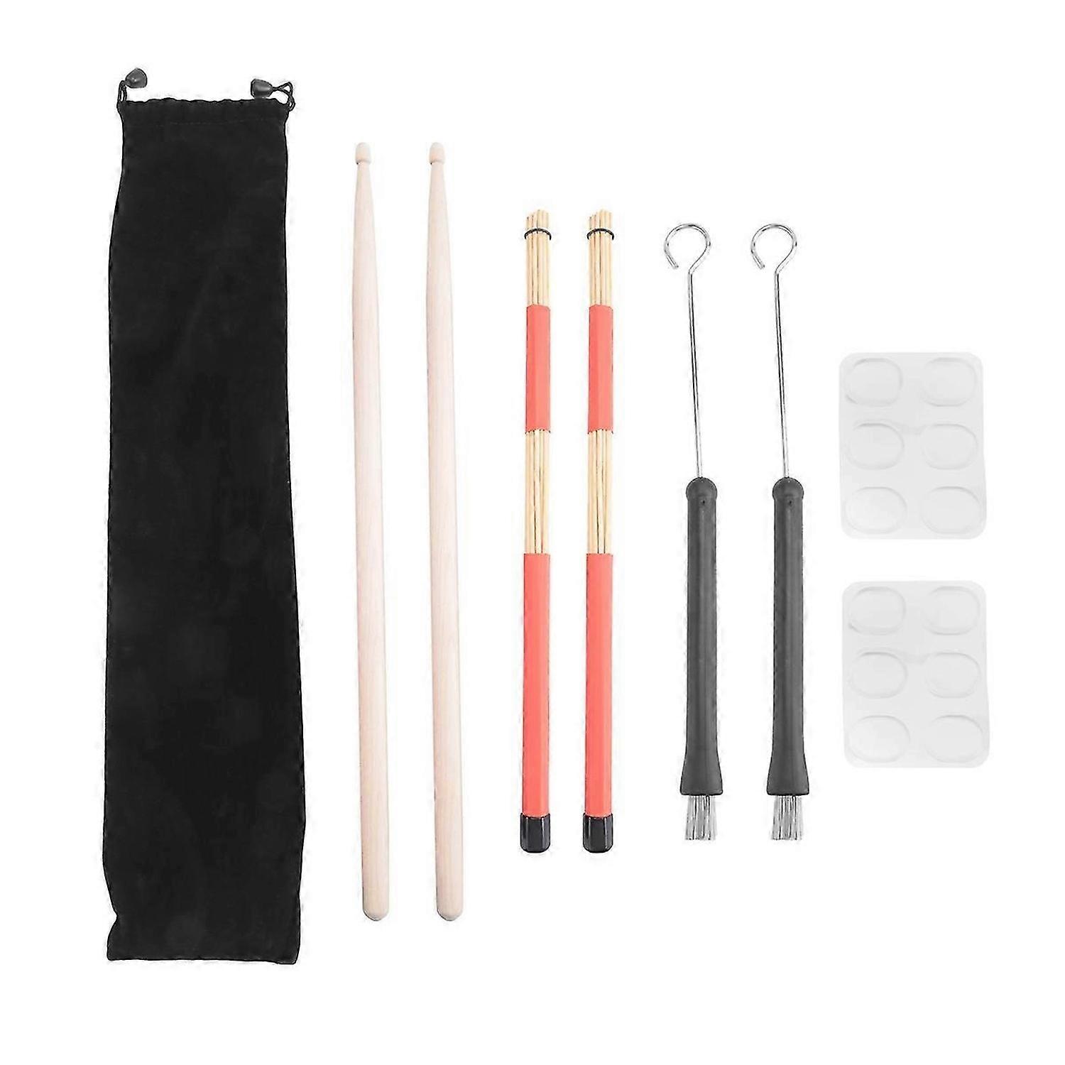 Good choices for drummer playing, beginner practicing,Kids, Adults, Rock Band, Jazz Folk Students,Music lovers. Retractable Drum Wire Brushes: drum brushes with wire brush feature a long rubber handle for comfortable grip, and retractable metal loop ends are easy and convenient to hang; drum wire brushes can be retracted for greater volume and articulation, retracting the bristles also protects the brush when it is not being used. Wooden Drumsticks - Made of good quality maple, polished with non-slip surface for comfortable grip, the classic drumsticks have characteristics of good resilience and responsiveness.They can provide you lighter and lower volume playing,perfect for youth rock bands and drummer playing. Silence Pads for Drums:Sticky and squishy, easy to stick them onto the drum head and won't fall off during performance. And you can remove them easily without residue when cleaning the drum. Drum silence pads can reduce the volume largely. Never need to worry about disturbing others. Just enjoy the charm of music completely. Drum Rod Brushes Sticks: Adopts several wood rods, special wrap near the brush sticks' neck provides a tight sound with just enough texture and improves durability , great for drum, jazz, folk and other soft music performance<br><br>colour: as shown Material: metal + wood<br><br>Package Contents: 1 pair x retractable drum wire brushes 1 pair x rods drum brushes sticks 1 pair x 5A maple wood drum sticks 6 pairs x silence pads 1 x storage bag<br><br>Only the above package content, other products are not included. Note: Light shooting and different displays may cause the color of the item in the picture a little different from the real thing. The measurement allowed error is +/- 1-3cm.