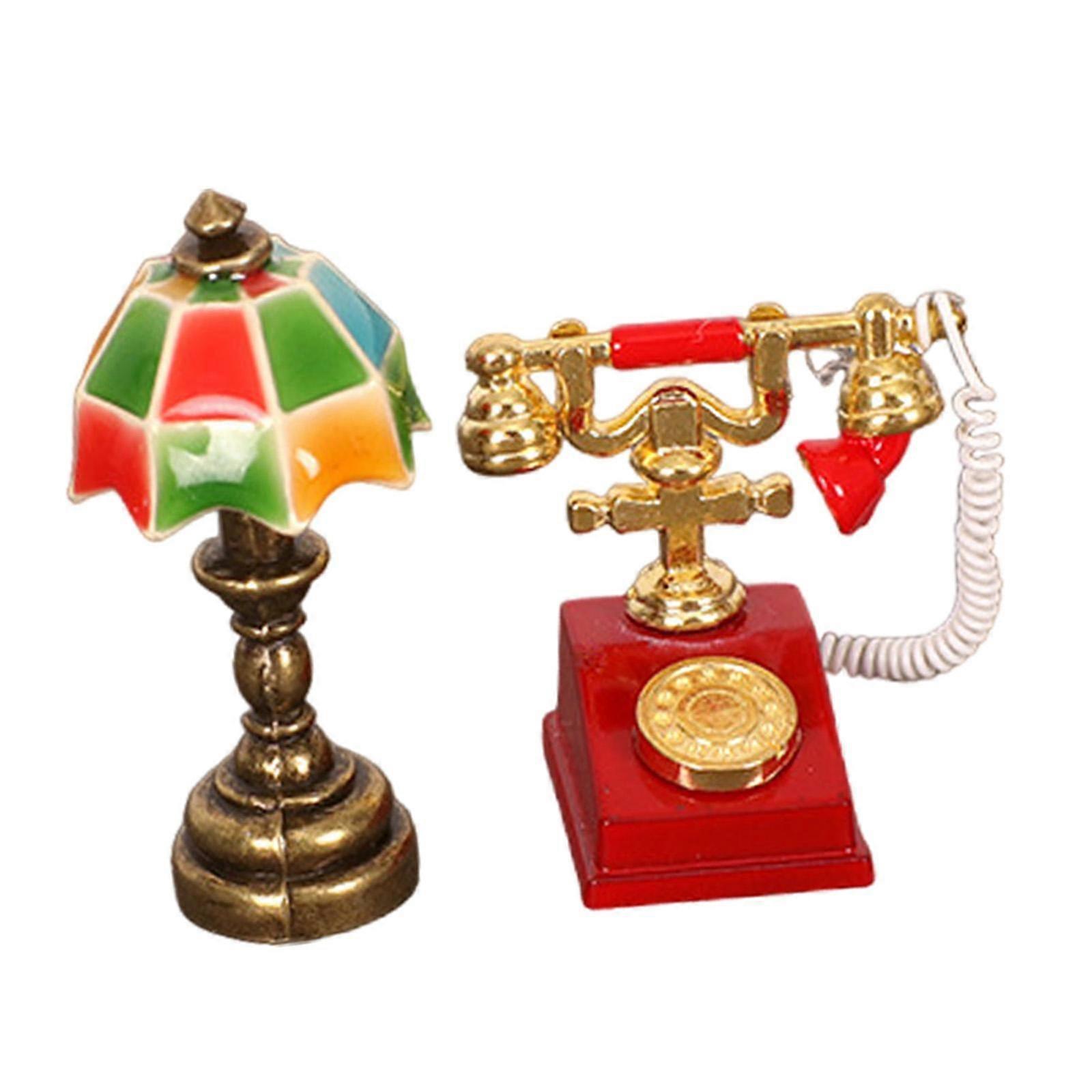 Dollhouse Miniature Lamp and Rotary Phone Set 1/12 for Micro Landscape Decor multicolor
