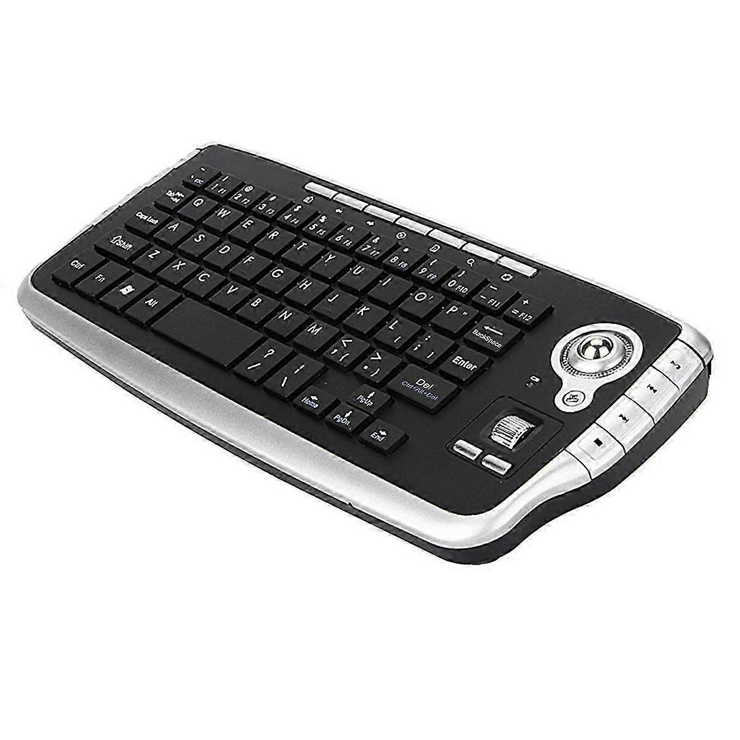 2.4 GHZ wireless communication-availble within 9 m and anti-jamming More convenient keyboard and mouse integration and faster operation Optical-sensor truckball controller, eaxact and frequent and positon Flat and comfortable key design Muti-languaage partisan<br><br>Scroll wheel technology, randomly turn between two directions Intelligent power indicator lamp Easy to carry trip or home HTPC and computer applications thin disc, multimedia keys, fixed-point trackball, feel comfortable, reliable, simple structure Classic key position 78, the installation of 20 multimedia keys, and built a resolution of up to 1000 DPI trackball mouse, Left and right mouse button in the keyboard for the user to facilitate the use of the remote control, and the other in order to allow users to easily on the desktop, the Bottom right corner of the keyboard also has the mouse left and right keys and wheel keys. Product parameters: Connection:2.4G wireless Size:26 x 12 x 2.5 cm Product weight:210g Mouse DPI:1200 Tracking method: Mouse trackball Power suppply:2pcs AA battery(Not included batteries) Button lifetime:8 million times System requirements:Windows 2000, Me, XP, Vista, Win 7, Linux, Android and Mac Material: Rubber + metal Color: Black & Silver<br><br>Package Contents: 1 * Keyboard 1 * English manual 1 * USB mini receiver<br><br>Only the above package content, other products are not included. Note: Light reflection and different displays may cause the color of the item in the picture a little different from the real thing. The measurement allowed error is +/- 1-3cm.