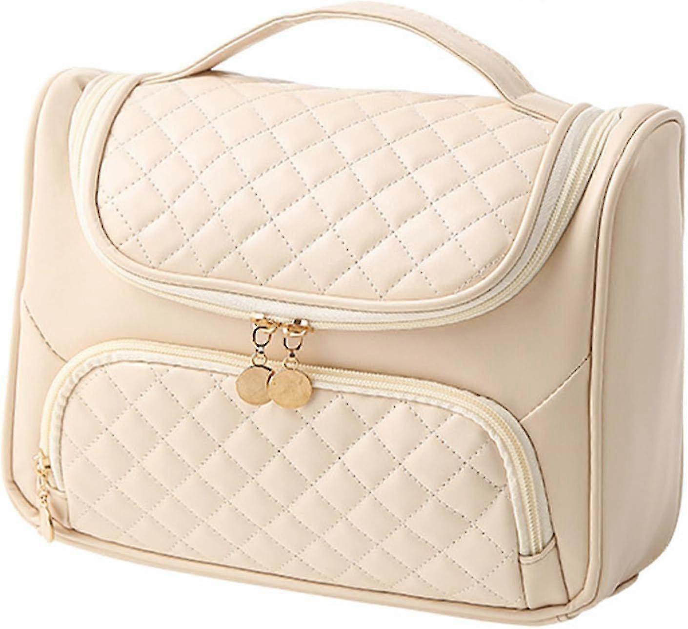 Travel Toiletry Bag Large PU Leather Cosmetic Organizer with Handle for Women Beige