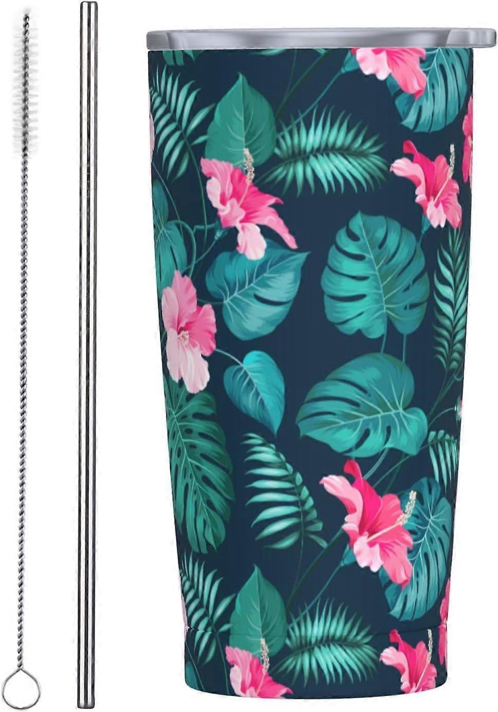 Tropical Hawaiian Flowers Tumbler Stainless Steel Insulated Tumblers with Lid Straw Reusable Tropical Palm Leaves Coffee Travel Mug Tea Wine Cups Birt