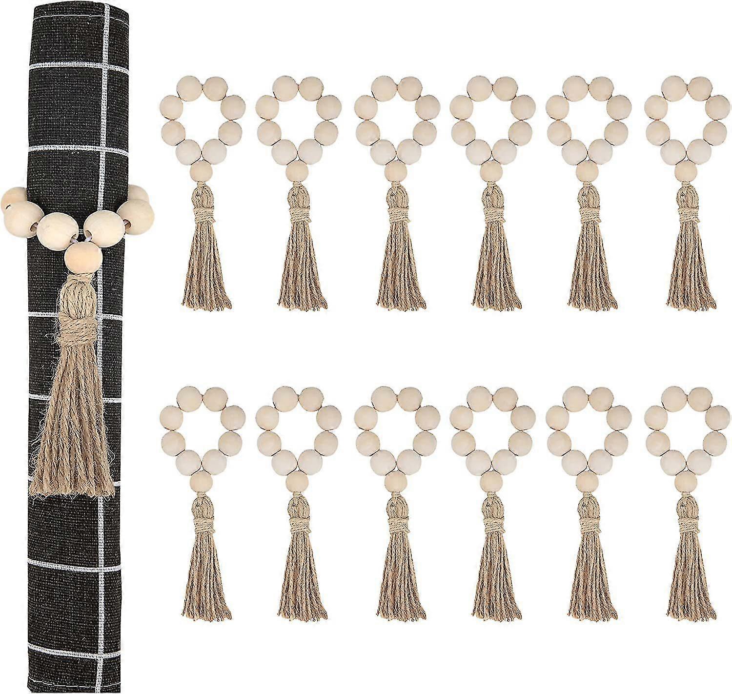 Napkin Rings Set Of 12, Handmade Farmhouse Wood Beaded Napkin Ring With Rope Tassel Tabletop Decor For Dinning Table Setting, Party, Wedding, Family G
