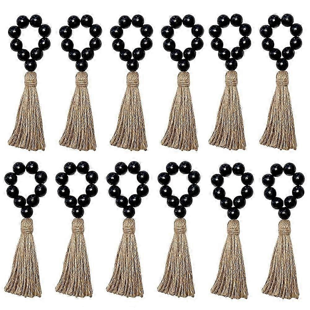 Napkin Rings Set of 12,Wooden Napkin Rings,Wood Bead Elastic Farmhouse Napkin Rings with Tassel,Boho