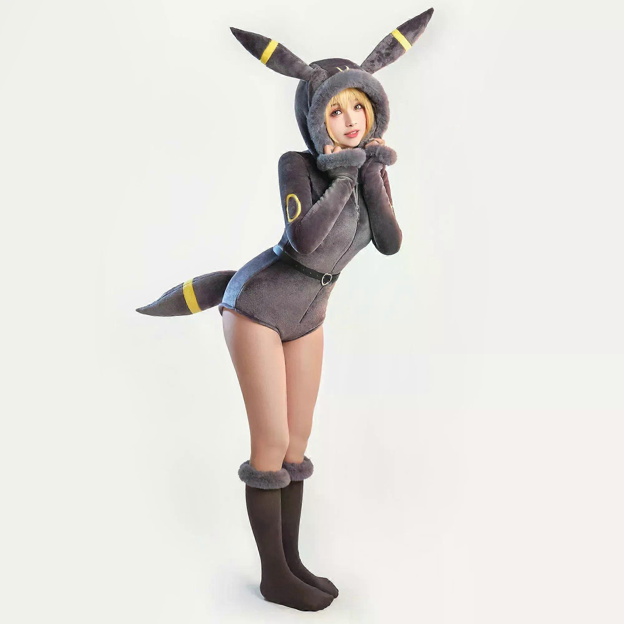 Meowcos Women Genga Cosplay Costume Halloween Purple Ghost Romper Bodysuit Plush Hooded and Socks with Belt and Tail