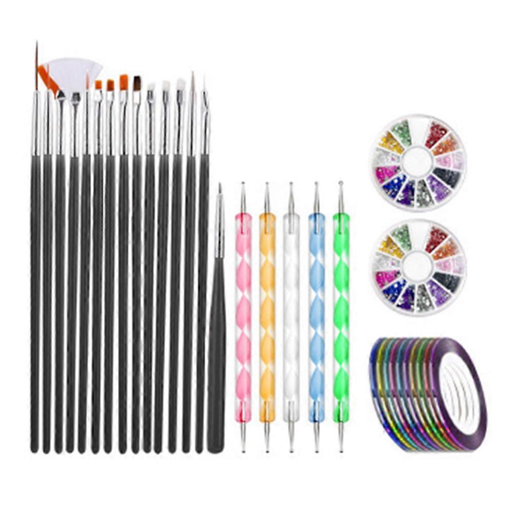 Product Description Colors: White, Pink, Black Quantity: 32 pieces total Material: Acrylic + Stainless Steel + Fiber Package Contents: 15 x Nail Brushes 5 x Dotting Pens 10 x Nail Art Striping Tapes 2 x Rhinestones 1. 【Complete Nail Art Brush Set】 - Our nail brush set includes 15 brushes in various sizes, ensuring you have the right brush for every nail art task. These brushes feature fine, lightweight, and comprehensive brush tips for diverse nail decorations and paintings. Made from high-quality acrylic and fiber. 2. 【Double-Sided Dotting Pen】 - Crafted from metal alloy and acrylic material. Features 5 different tip sizes to meet various nail art needs. Use it to create uniform or decreasing sized dots, or to meticulously create petal shapes with fine details. 3. 【Wide Application】 - This nail brush set is especially suitable for nail art enthusiasts, as well as for home use and professional nail salons, making your nails more beautiful and charming. Our nail brush set makes a perfect gift for yourself, mom, wife, sister, and daughters. 4. 【Great Set for Your Amazing Manicure】 - Scope of delivery: 15 x nail brushes, 5 x dotting pens, 10 x nail art striping tapes, 2 x rhinestones.