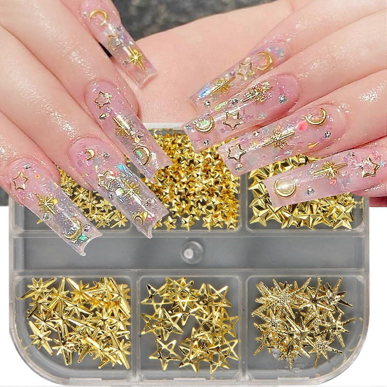 6 Grids Star Nail Charms for Nails Art 3D Metallic Gold Star Nail Charms Studs