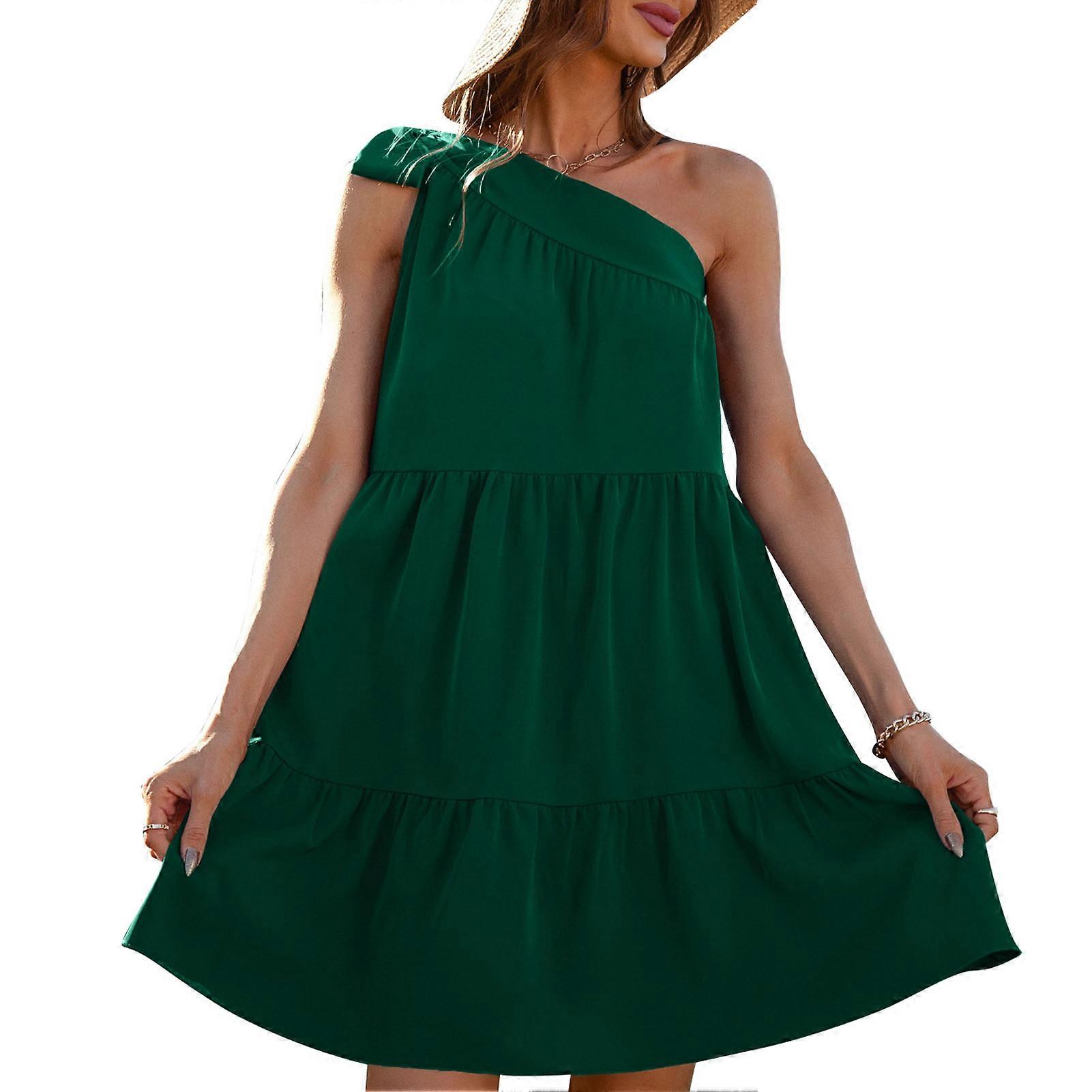 Tie Knot One Shoulder Dress Ruffle Hem Pure Color Sleeveless Casual Summer Women Dress Dark Green S