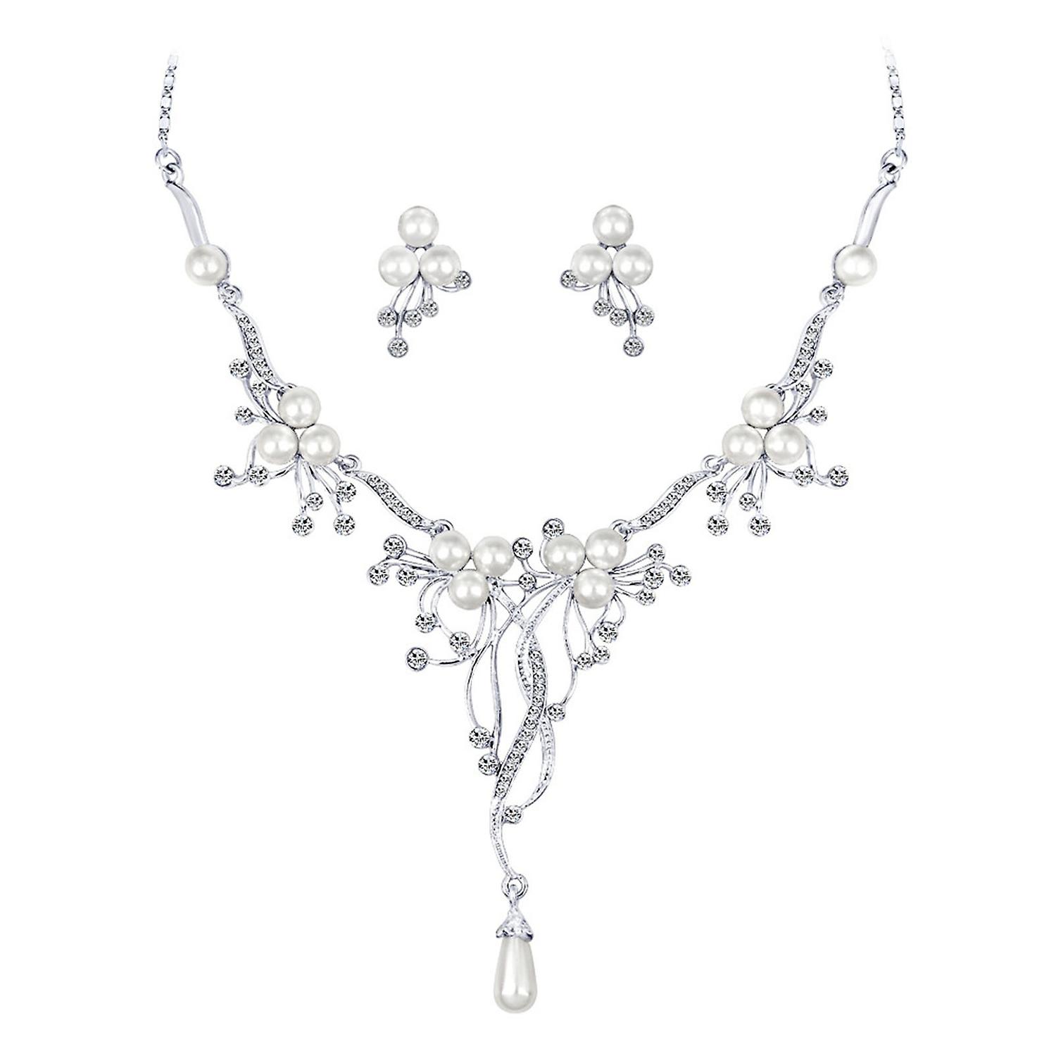 Necklace Earring Set Faux Pearl Rhinestone Decor Flower Shape Hollow Out Adjustable Hanging Earrings