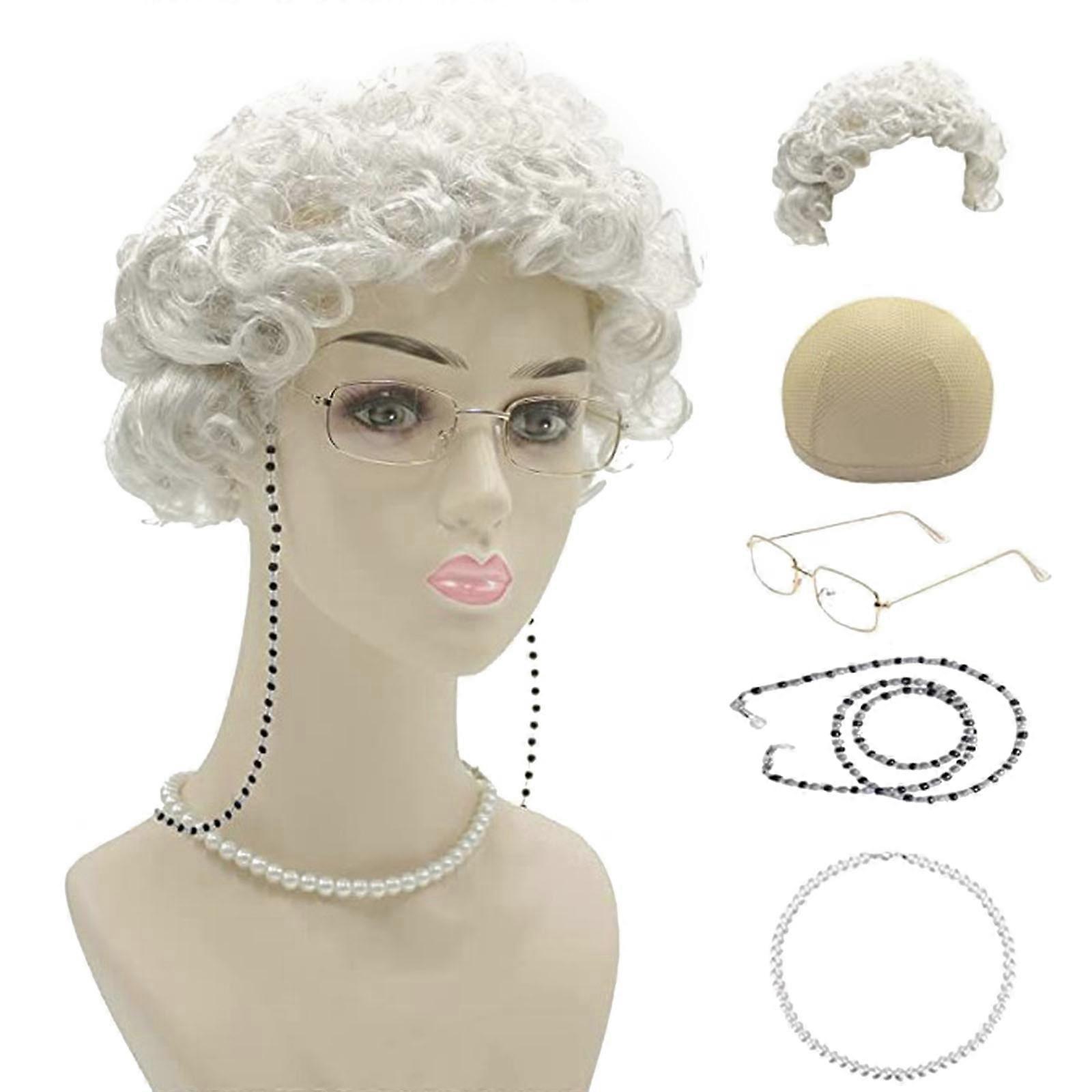 Novelty Old Lady/Men Costume for Kids - 5 Pcs Set for 100th Day of School Grandma Costume for Kids Girls, Gray Wig, Glasses with Chain, Wig Cap, Neckl