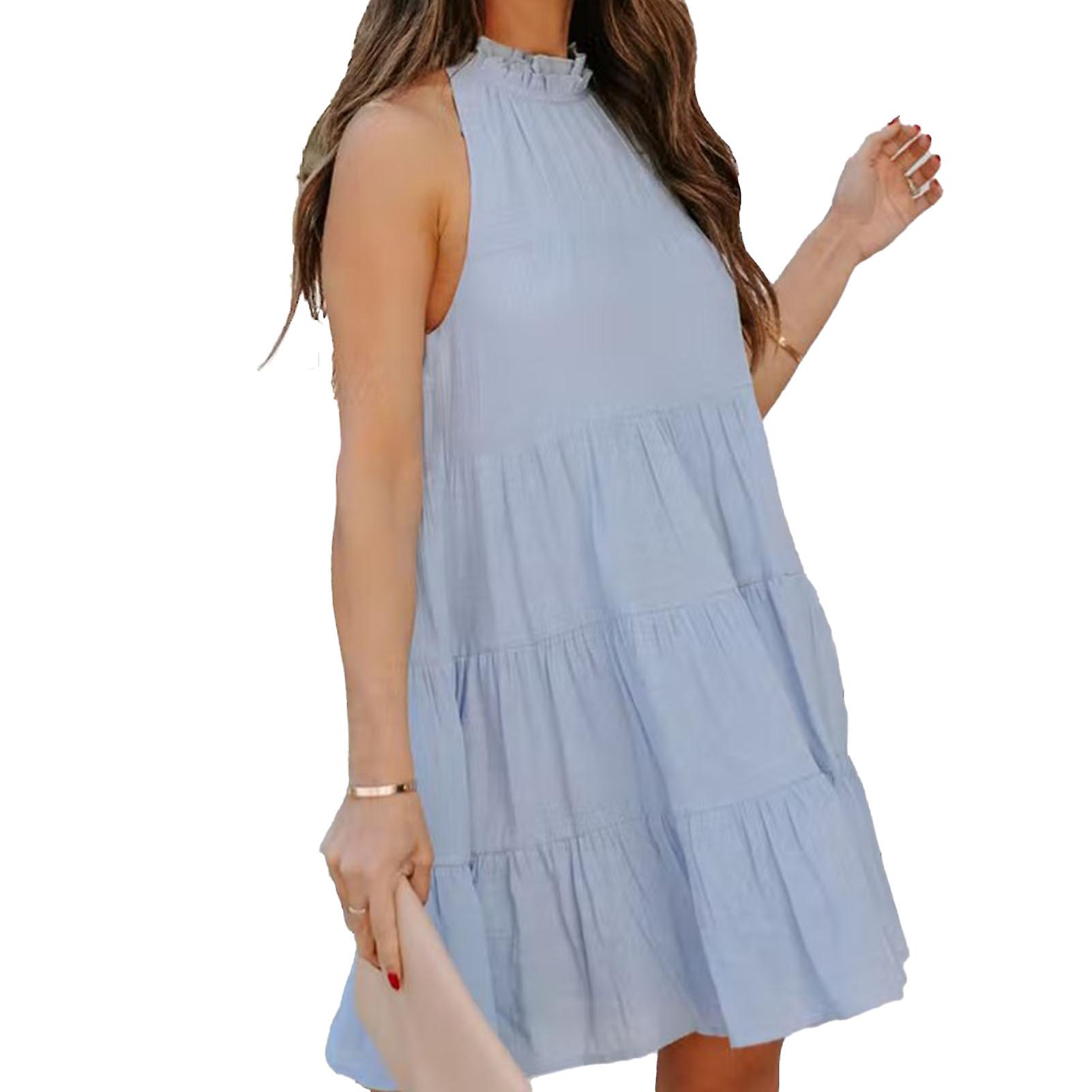 Sleeveless Dress Fungus Trim Collar A Line Ruffle Hem Loose Fit Pure Color Summer Dress for Daily Party Office Light Blue S