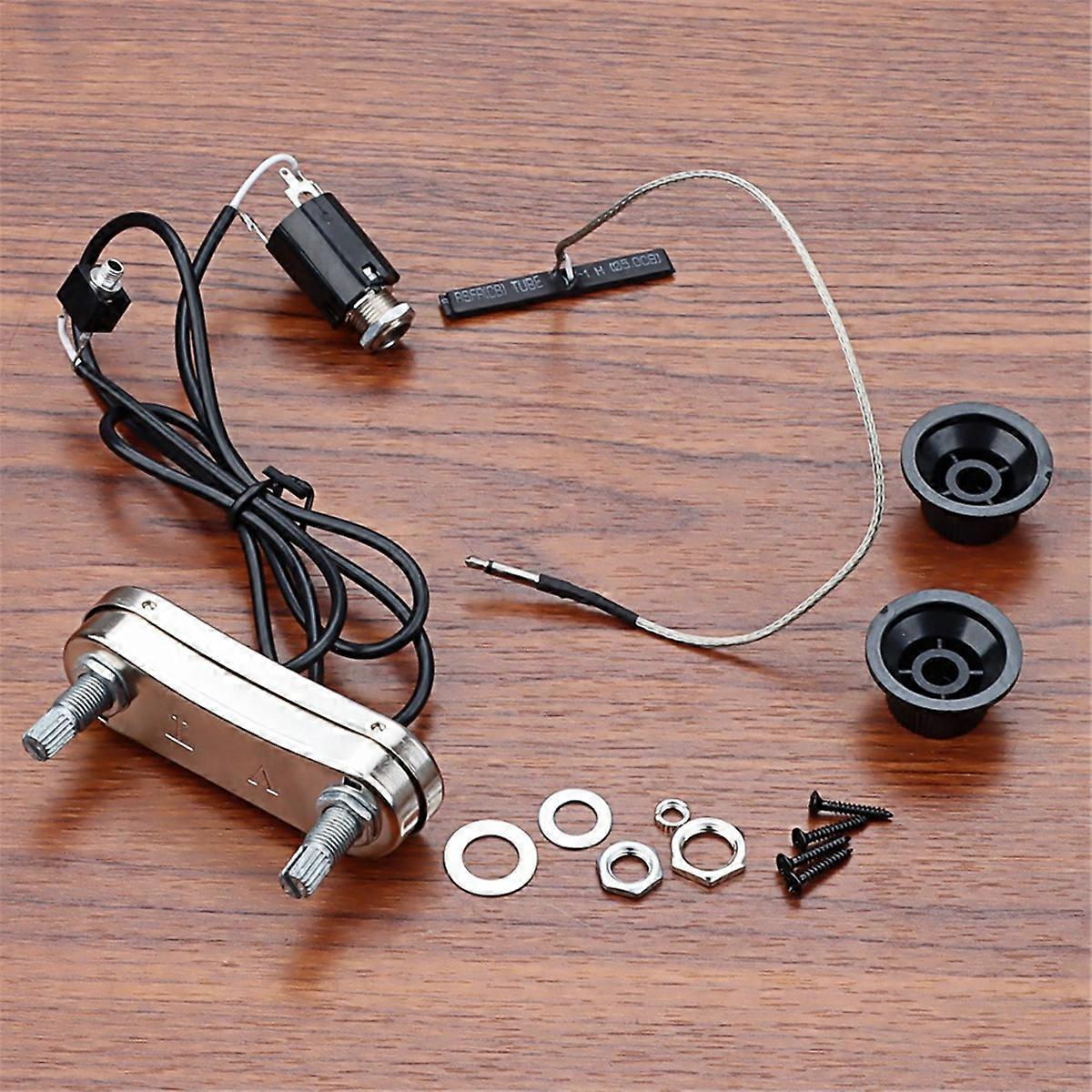 This complete pickup set to make your individual electric Violin sound This set includeds tone knob,volume knob,pickup bar with 2.5mm plug,pickup with transducer and 6.35mm jack Please note that the transducer must sit on a flat so this can not be used on a traditional violin;should be used on solid body or other design that has a under Use this set to amplify your instrument's sound Colour:As Shown Material:Metal+plastic Package Contents: 1x Violin Pickup Only the above package content, other products are not included. Note: Light reflection and different displays may cause the color of the item in the picture a little different from the real thing. The measurement allowed error is +/- 1-3cm.