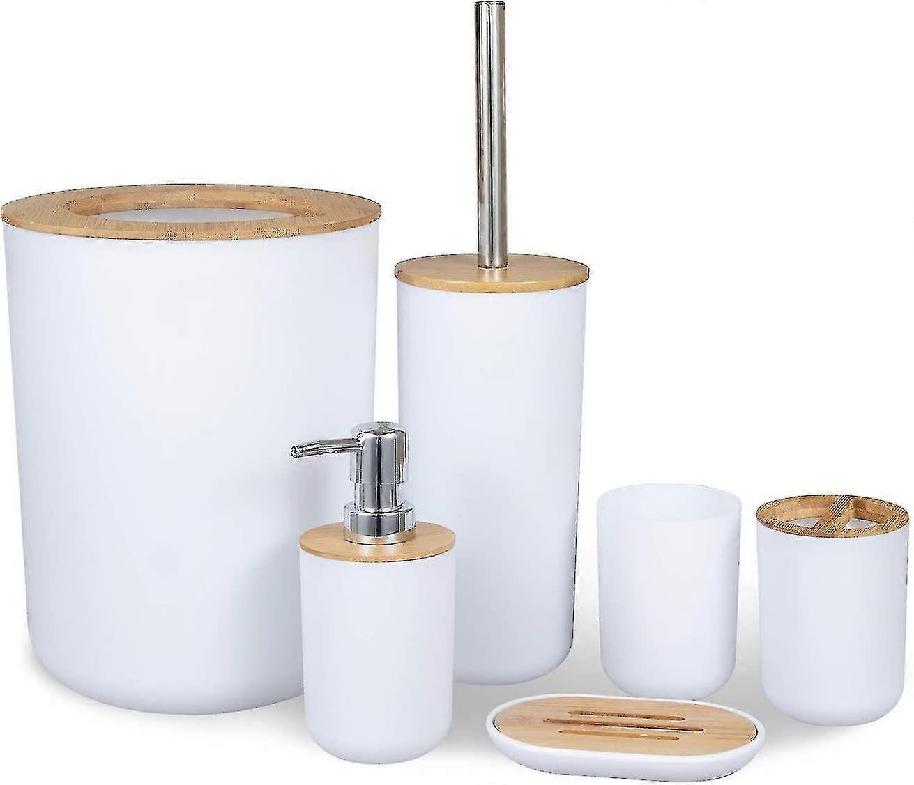 Product DescriptionMaterial: plastic + bambooSize: 19.5 * 19.5 * 25cm (trash can)White colorQuantity: 1 setPackage Content: 1 * Household Trash Can1. Ecological Material Bathroom accessories set in natural bamboo trim and eco-friendly polypropylene plastic, cleverly chosen them to be damp, stainless, corrosion resistant and easy to clean, which ensures them a long life and durability2. Enjoy Life Wooden bathroom accessory set in soft colors and simply modern design, add an elegant note to your bathroom and easily create the warm atmosphere of an almost 5 star hotel with this set bamboo accessories3. Sets Include Soap Dispenser, Toothbrush Holder, Toothbrush Cup, Bathroom Bin, Soap Holder, Toilet Brush and Toilet Holder. A modern bathroom set is perfect for more convenient access to cleaning supplies and to avoid cluttering the dressing table4. Multi-Use Perfectly sized and beautifully styled, these wood bathroom accessories with bamboo trim are suitable for master, family or guest bathrooms. They can also be elegant bathroom decorating accessories for hotels, resorts or in the cottage
