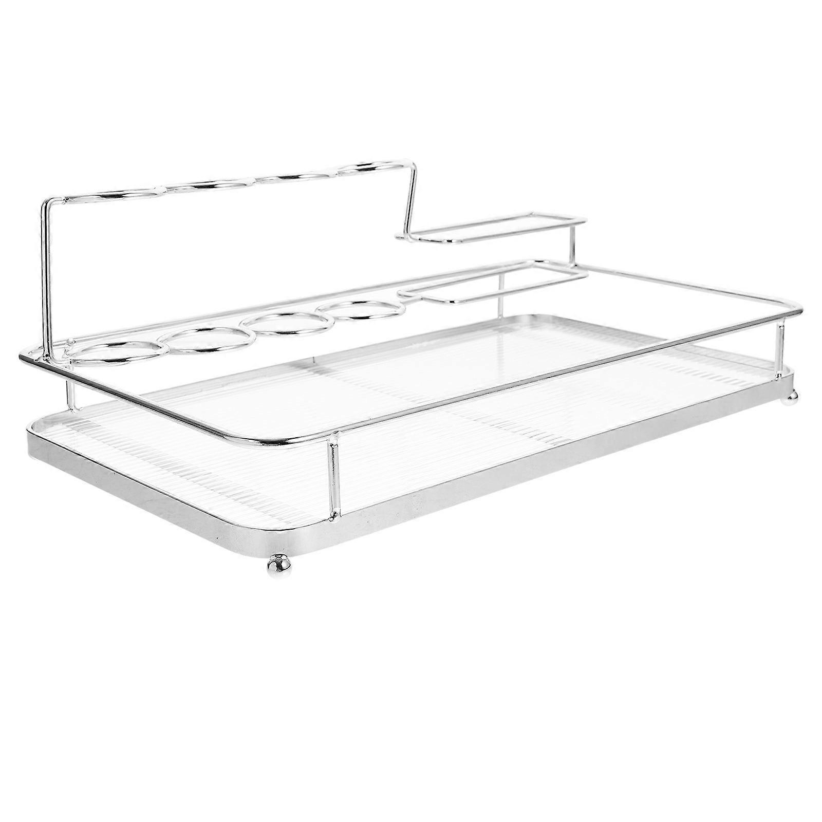 This storage tray is easy to store things. storing sundries and snacks. It can effectively help organize small objects, with a humanized design, and can accommodate all kinds of small objects, such as seasoning bottles, etc. Features - Color: Silver -Material:Iron, acrylic - Size: 30.00X16.50X9.90cm/11.79X6.48X3.89in - This storage tray is made of sturdy iron and acrylic, which are not easy to deform, has strong bearing capacity and can be used for a long time. - Designed into a rectangle shape, the storage tray is suitable for placing in the corner of the kitchen and bathroom. - This display tray has a large capacity, can be used for different item's storage use in bathroom, such as toothbrushes, toothpastes, soap and cups. - This bathroom and kitchen organizer is sturdy, and easy to clean, ensuring long-term use. - The bathroom countertop organizer has draining holes, which makes it good for bathroom toiletries storage use. Package list: 1 × Bathroom Countertop Organizer