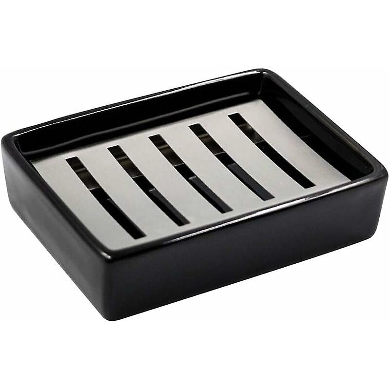 Stainless Steel Ceramic Soap Dish for Bathroom, Double Layer, Self-Draining Soap Dish, Say No to Fluffy Soap, Easy Cleaning (Black) 11.6X8.8X3cm