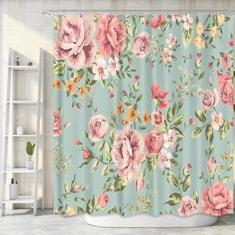 Pink Floral Fabric Shower Curtain for Bathroom 72Wx72H Inch Rose Floral Blooming Green Leaves for Girl Women Bathtub Accessories Decor Rustic Waterpro