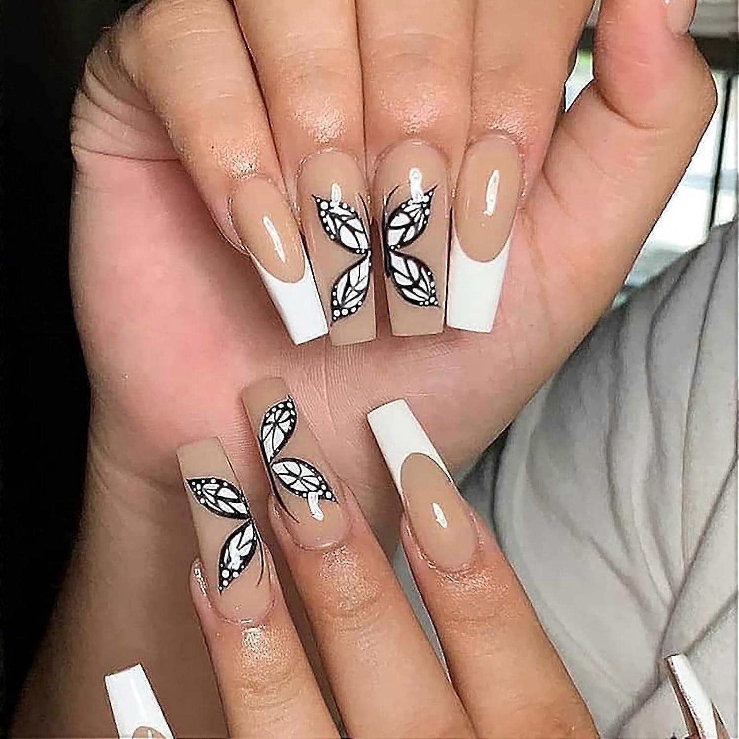 Butterfly Long Coffin Nails - Fake French Nails with Glue, Press on Nails