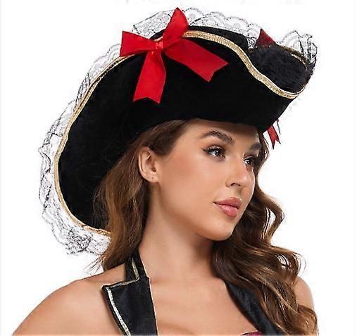Buccaneer Costume Hat Pirate Captain Hat With Lace Trim And Red Bow Pirate Headwear For Women Adults Halloween Costume Accessory