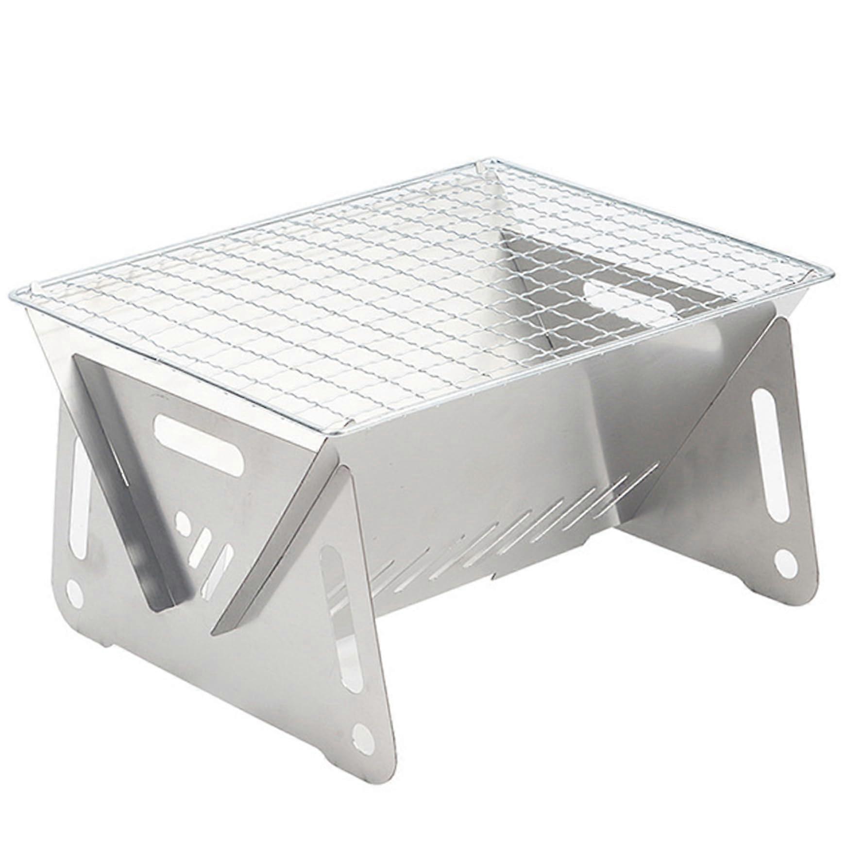 Portable folding wood stove made of stainless steel with mesh and carrying bag for backpacking, hiking, and camping.