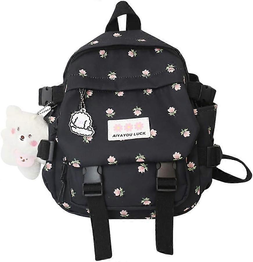 Backpack 10.6 Inch Kawaii Backpack With Pendant Mini Backpack Cute Backpack Japanese Bag Flowers Backpack (Black)