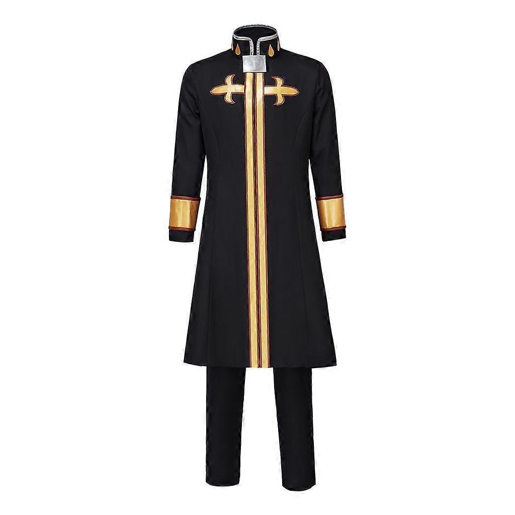 Copy Description This elegant baroque-style knight cosplay costume is designed for men who want to stand out at stage shows, carnivals, Halloween events, or cosplay conventions. Featuring a long black coat with striking gold details and matching pants, this uniform embodies the spirit of a noble medieval warrior. The high collar and embroidered cuffs add authenticity and flair to the look. Set includes: Long coat + pants Design: Inspired by medieval European knight uniforms with baroque styling Material: Comfortable polyester blend, breathable and durable Ideal for: Cosplay, stage performance, carnival, Halloween, historical reenactment Color: Black with gold trim Gender: Men Size Chart: Size Height Chest Waist Hip Shoulder S165170cm8691cm7176cm8994cm45.547cm M173175cm96102cm8186cm96102cm4849.5cm L175180cm106112cm9197cm104109cm50.552cm XL180185cm117122cm102107cm111117cm5354.5cm XXL185188cm127132cm112117cm122127cm55.557cm Please refer to the size chart carefully before placing your order to ensure a proper fit.