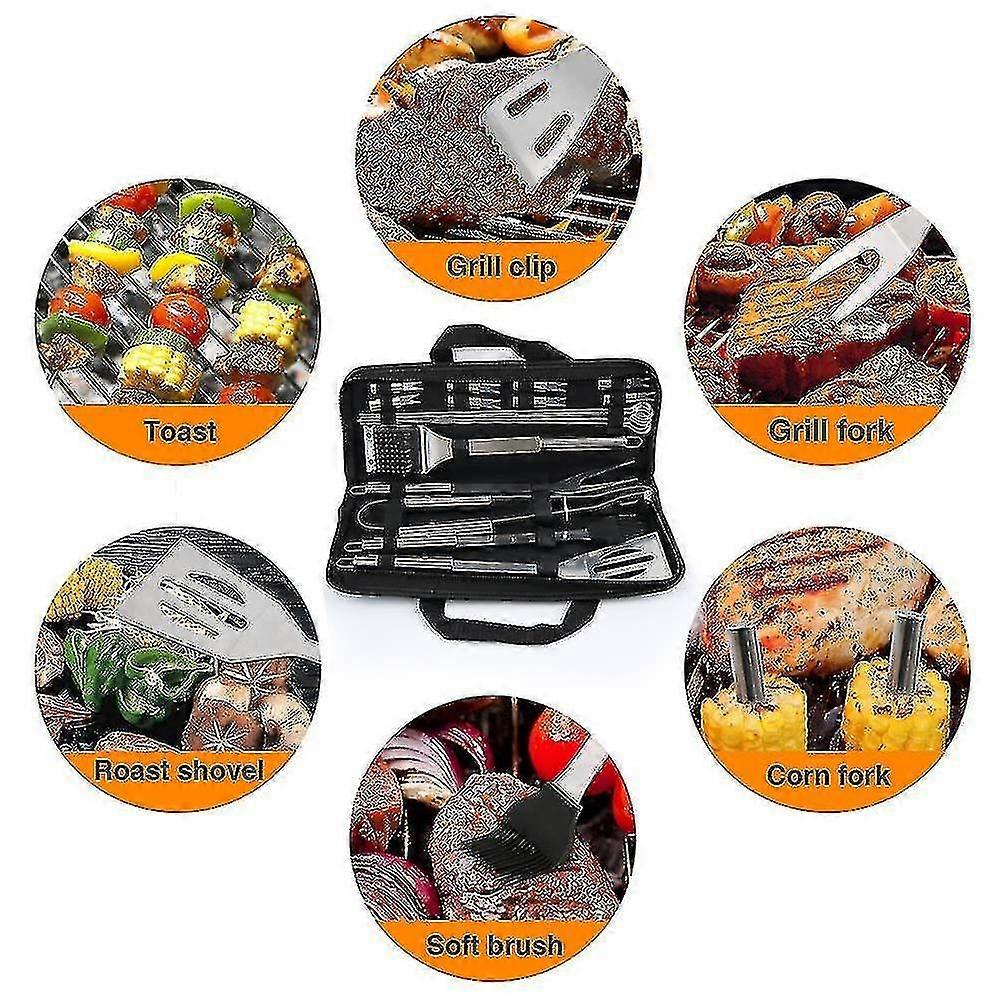 20 Piece BBQ Grilling Tools Set:This BBQ tool set comes with all that you need to get right into grilling in one package, includes: 1 soft basting brush (13.6"), 1 BBQ clip (13.8"), 1 barbecue fork (13.8"), 1 barbecue shovel(13.8"), 8 Corn Holders (2.6"), 7 stainless steel grilling barbecue sticks (14.2"), 1 wire brush(13.4").
