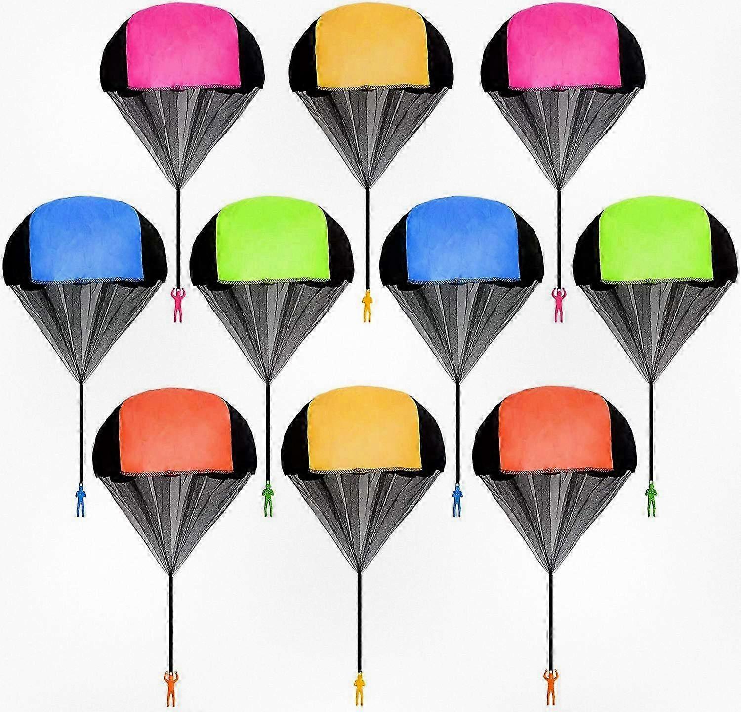 SAFE MATERIAL, FUNNY FOR KIDS, EASY TO USE --- Crafted from high-quality nylon material, this toy is non-toxic, recyclable, eco-friendly, and built to last for long-term enjoyment. Safe and amusing, it poses no harm to your kids, even upon landing. No batteries or assembly are required. Kids can easily enjoy it by tossing it high and watching it soar. GOOD FOR KIDS' HEALTH --- Engaging in outdoor sports is beneficial for children's health. By giving kids the opportunity to throw these parachute toys, they will step away from screens, playing in your playroom or outdoors for hours. This activity helps develop coordination and critical thinking skills in a practical manner while also enhancing their hand-eye coordination, observational abilities, and sense of direction. TANGLE-FREE DESIGN, LANDING SLOWLY --- No more tangled strings, making it suitable for both boys and girls. The parachute toy descends slowly, mimicking a real landing scenario, enhancing kids' motor skills, operational ability, intelligence, and creativity during playtime. FOR ALL AGE --- This toy isn't just for kids; the entire family can enjoy happy hours in open spaces like backyards, sandy beaches, grassy fields, doorsteps, parks, and more. It fosters parent-child bonding. With 10 parachutes included, children can race together, encouraging sharing and negotiation while learning about healthy competition. BEST GIFT CHOICE --- An ideal outdoor gift for kids, great for both boys and girls. It makes a perfect present for holidays like Easter and Christmas, birthday parties, or themed events, adding joy to your family time. These flying toys can also serve as prizes or rewards for good behavior at home. The best gift for children ages 3 to 9.