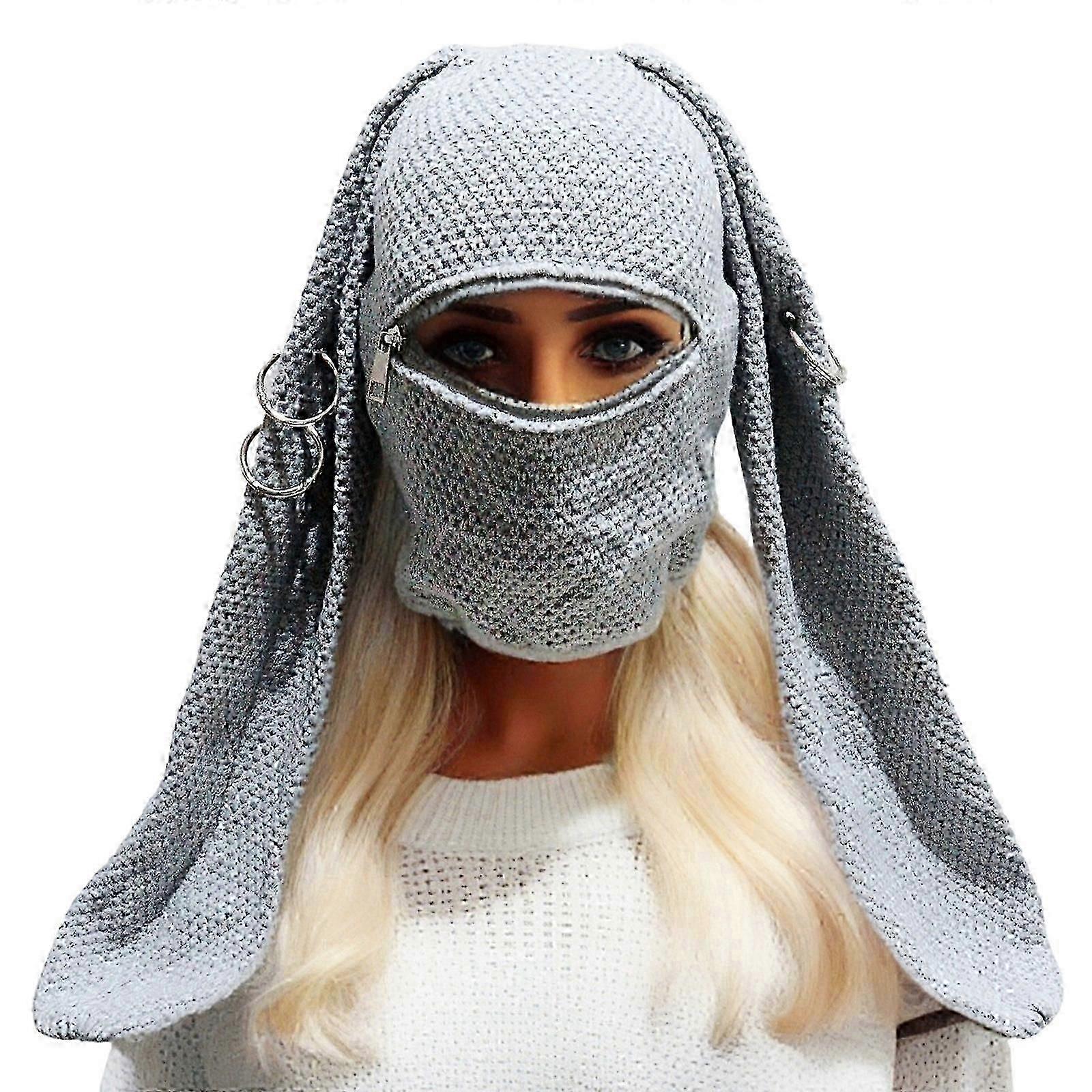 Punk Rabbit Ears Knitted Balaclava Caps for Teens Girl Winter Warm Face Mask Hat Adult Cosplay Costume Brimless for Outdoor Pink