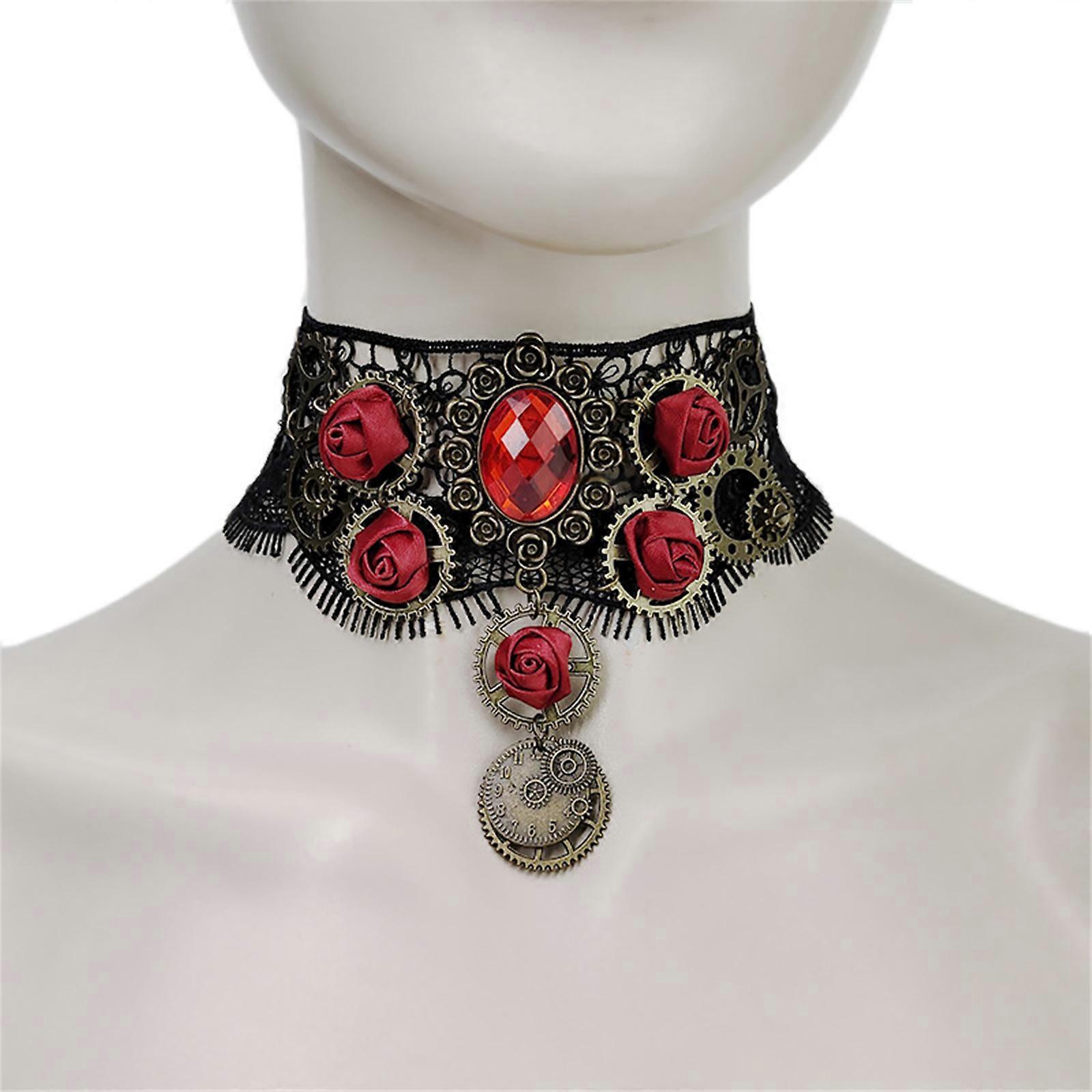 Punk Choker Necklace Flower Crystal Necklace for Girls with Delicate Gears and Rose Photo Props Wide Choker Red
