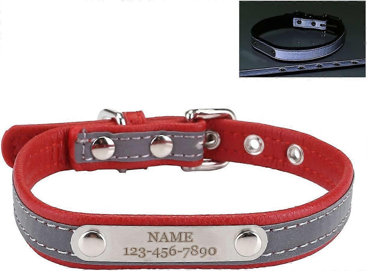 Personalized Leather Dog Collar, Reflective Custom Puppy Pet Collars with ID Name/Phone/Address Engraved Plate for Small Medium Large Dogs (M Size;Red