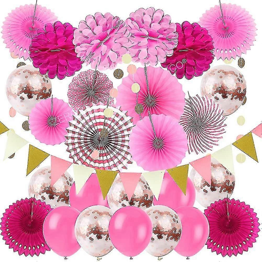 Party Hanging Paper Fans Set. Pink Confetti Balloons Decorative Folding Fans Paper Pompoms Triangle Bunting Flags Garlands For Wedding Birthday Baby S