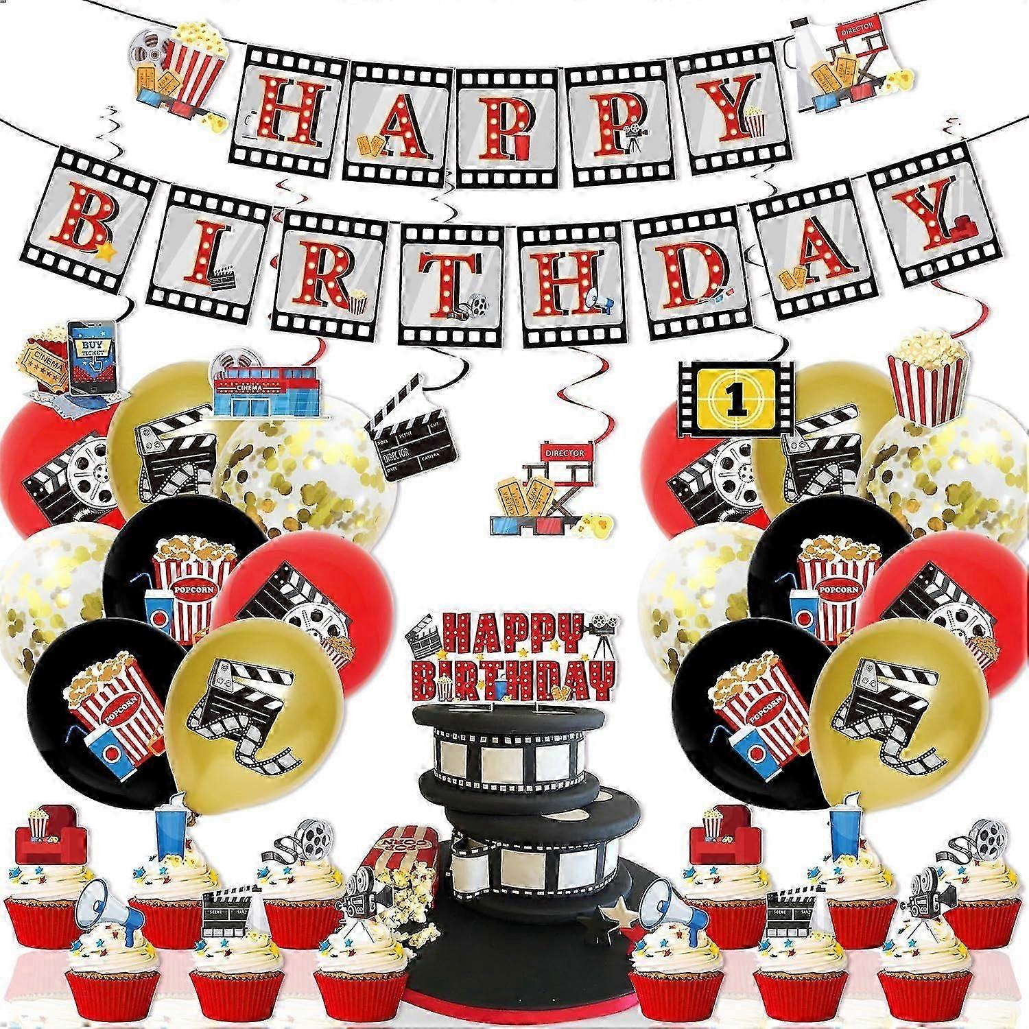 Party Supplies Movie Theater Themed Happy Birthday Banner, Movie Night Party Decorations Kit, Movie Themed Balloons, Cake Topper