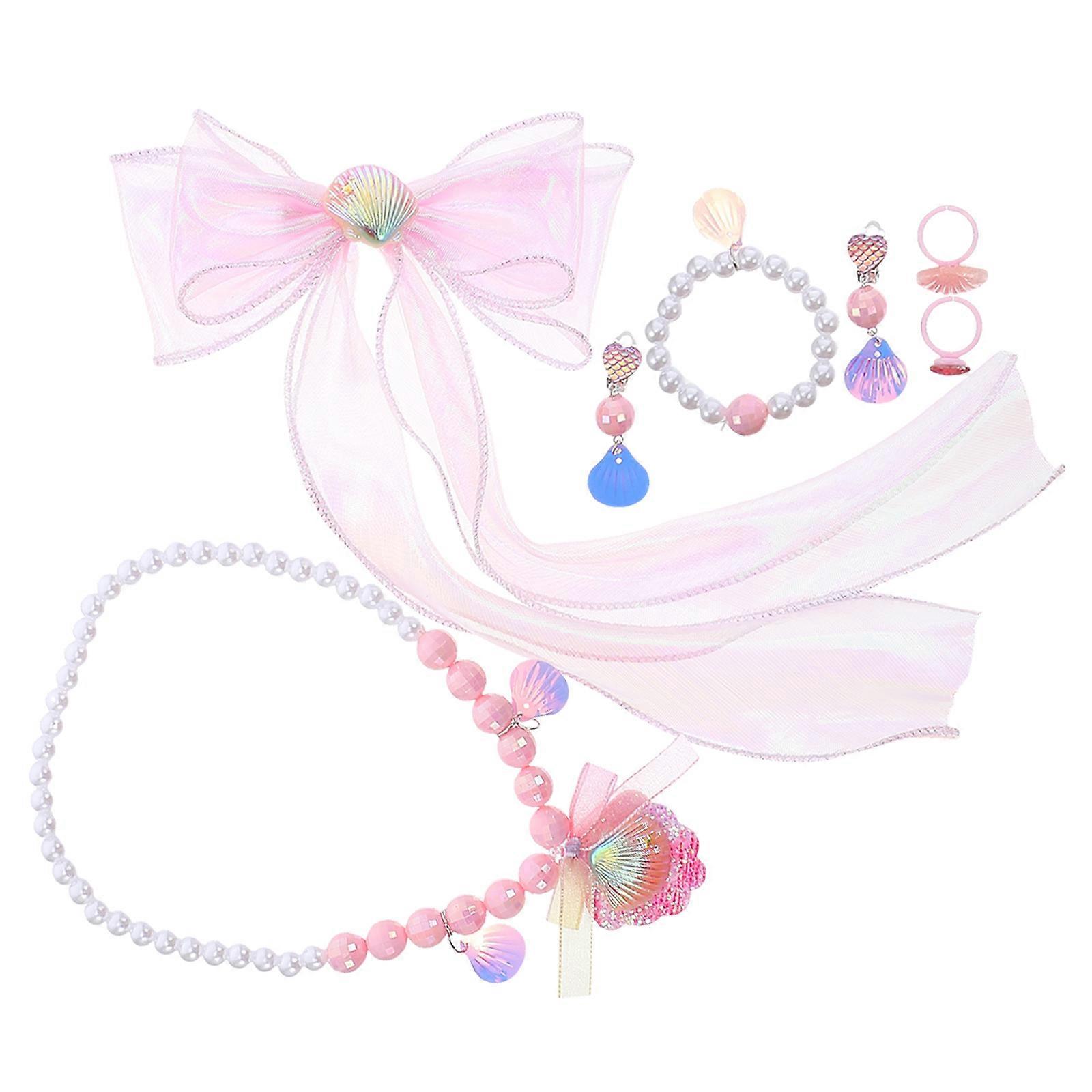 Mermaid Jewelry Set with Pearl Bracelet, Shell Necklace, Clip Earrings, Ring, and Bow Hair Clip – Non Irritating Accessories for Dress Up, Birthday