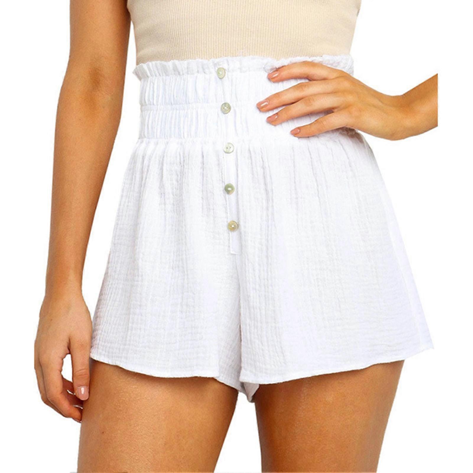 High Waist Shorts Elastic Detailed Button Soft Breathable Beach Shorts for Women Girls Holiday White S