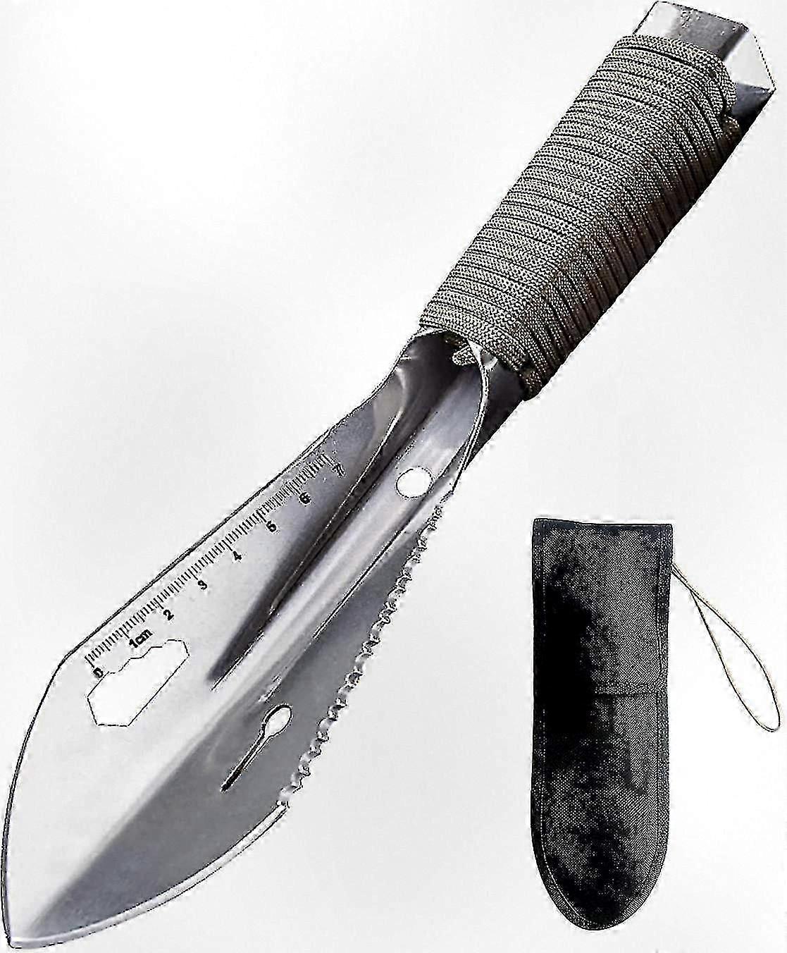 SERRATED EDGE DESIGN: Features a sharpened edge for digging and a serrated edge for cutting through wood.COMFORTABLE GRIP: Handle made from soft nylon rope, which can be detached for emergency use.ULTRALIGHT & PORTABLE: Lightweight and easy to carry, this sturdy shovel fits easily in your bag. The carry pouch has a loop for attachment to a belt or backpack.DURABLE & HIGH QUALITY: Constructed from heavy-duty hardened steel, this trowel is resistant to bending and wear. The rust and scratch-resistant blade stays sharp and is easy to clean.ALL-IN-ONE SURVIVAL TOOL: Essential for outdoor enthusiasts, this multi-functional shovel is ideal for digging, sawing, chopping, cutting, chiseling, and more. Perfect for hunting, camping, hiking, and gardening tasks like weeding and digging in tough soil.