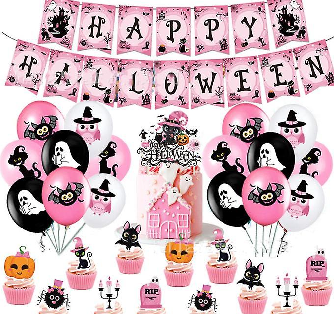 Halloween Birthday Party Decoration With Happy Birthday Banner, Pink Halloween Cake Cupcake Toppers And Balloons For Kids Girls Halloween First Birthd