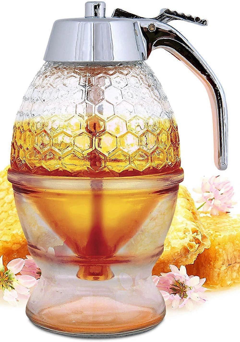 Honey Dispenser No Drip Glass - Maple Syrup Dispenser Glass - Beautiful Honey Comb Shaped Honey Pot - Honey Jar with Stand, Great Bee Decor