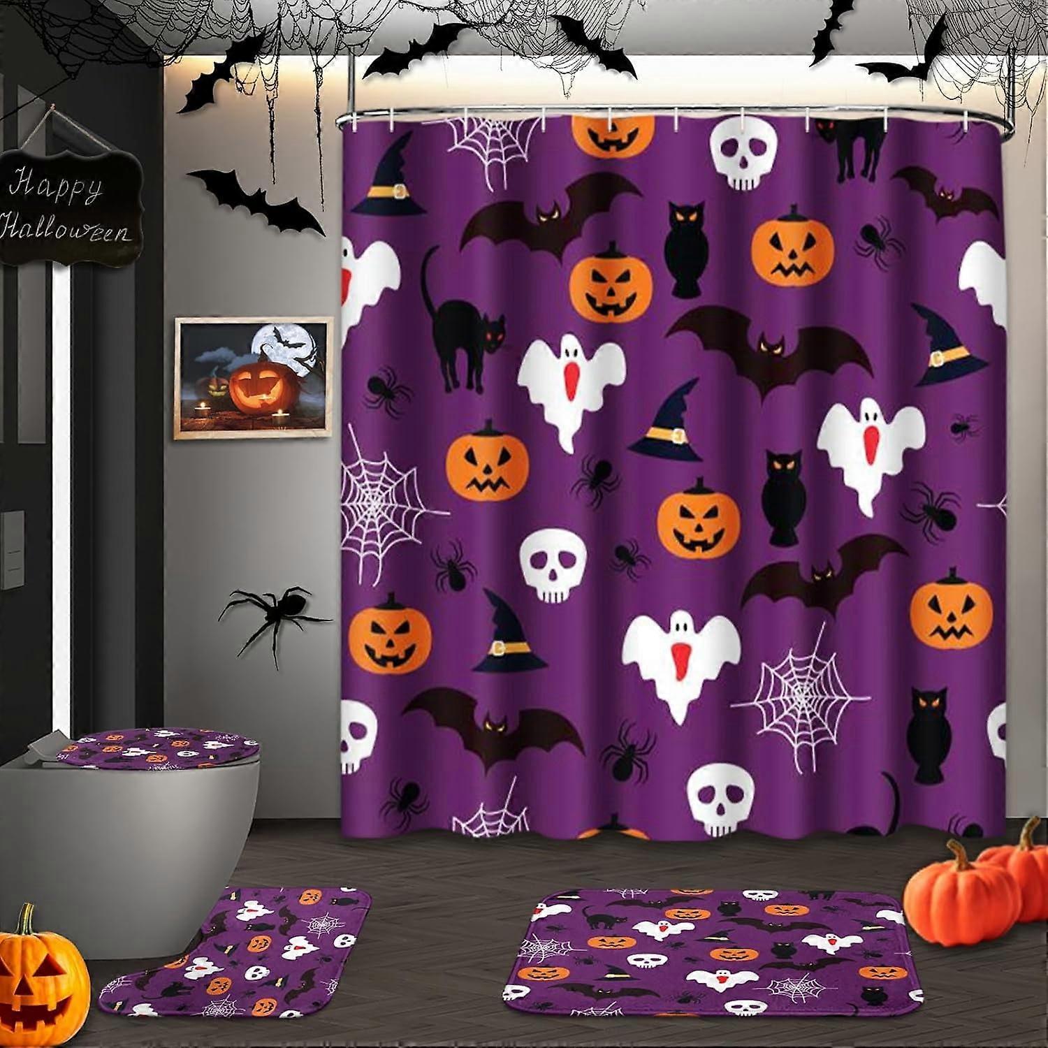 Halloween Skull Flowers Shower Curtain Set with Toilet Lid Cover & Non-Slip Rugs, Vintage Rose Floral 4 Pcs for Bathroom, Black Fall Decor