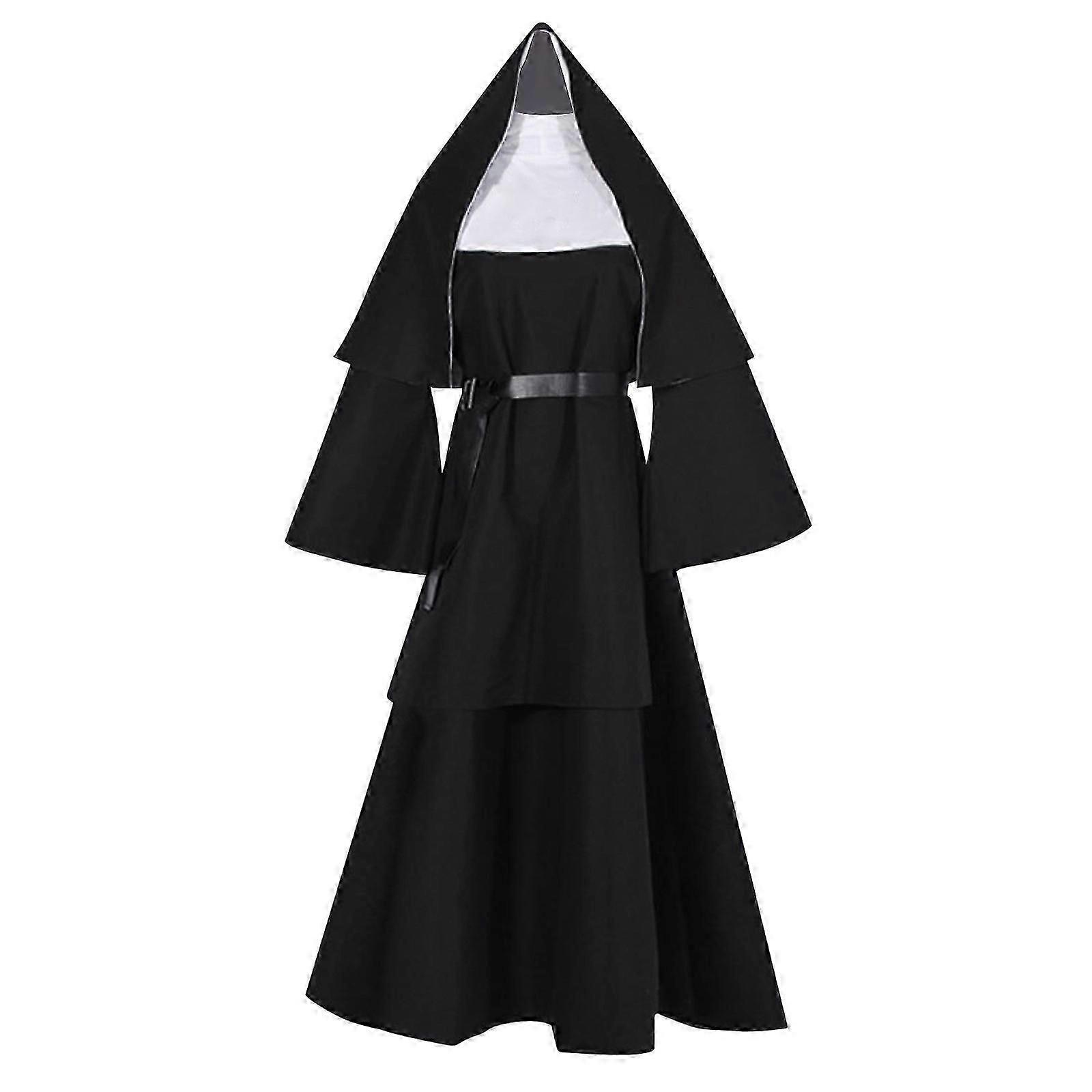 Halloween Nun Cosplay Costume 4-Pieces Set Nun Costume + Cape + Belt + Necklace Cosplay Costume-XXX
