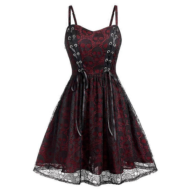 Halloween Costumes Gothic Lace Up Party Dresses For Women Retro Skull Print Bandage Patchwork Spaghetti Strap A Line Dress Robe-wine red