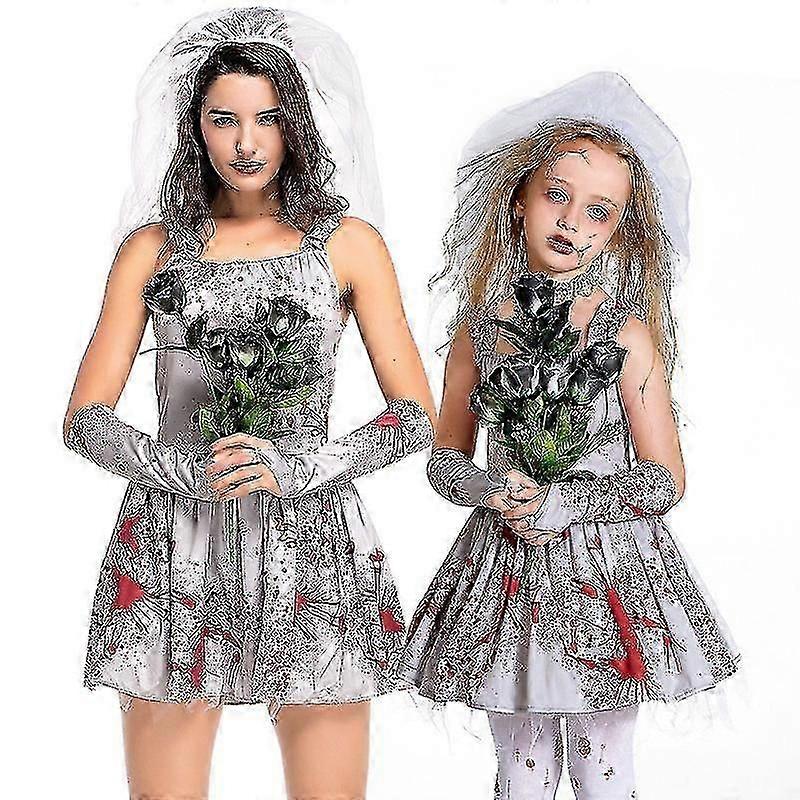Halloween Ghosts Brides Zombie Costumes Children Adult Horror Gray Bloodstains Wedding Dress Makeup Ball Suspenders Puffy Skirt Children's Set