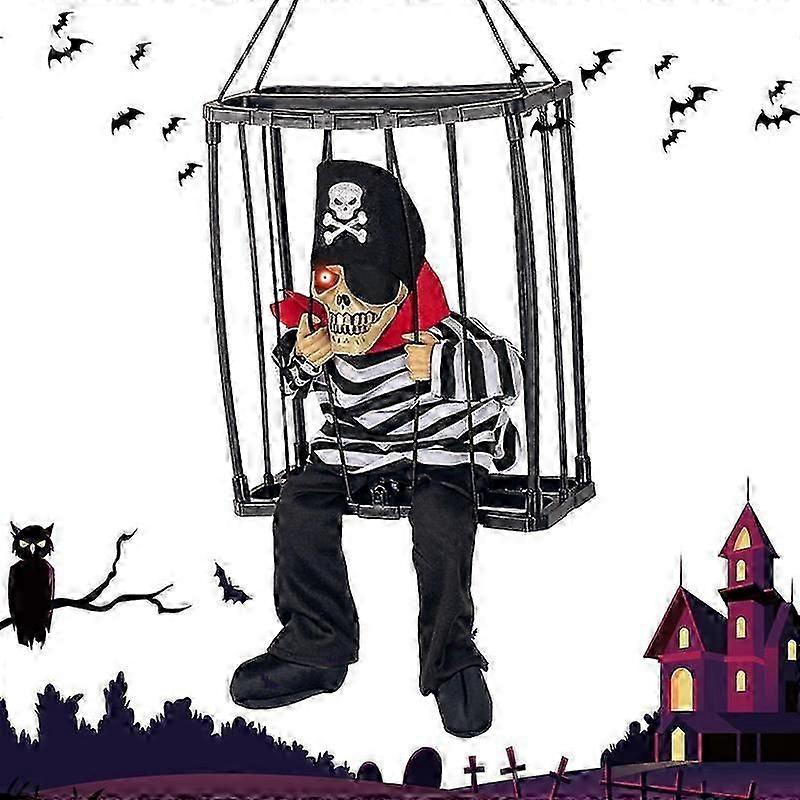 Halloween Decoration Prisoner Ghost In Cage Scary Skull Prop Electric Skeleton Toy Glowing Eye Sound Doll Hangable Talking Ghost