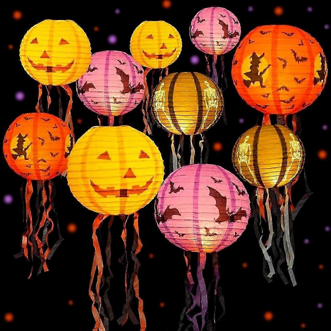 Halloween Decorations Paper Lanterns with LED Light, 10 inch Hanging Pumpkin Witch Skeleton Bat Lanterns for Indoor & Outdoor Halloween Home