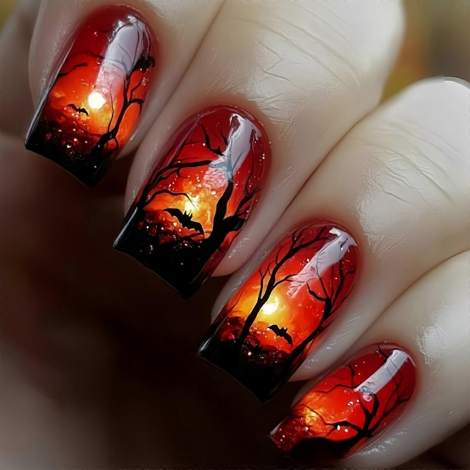 Halloween Themed Press On Nail Medium Length Square Shape Fake Nail With Forest Design For Parties Event Wear 24pcs Multicolor