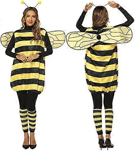 Halloween Yellow Honey Bee Clothes Outfits For Women 4pcs Party Dress Up Accessories Headdress+Striped Top+Wings+Socks