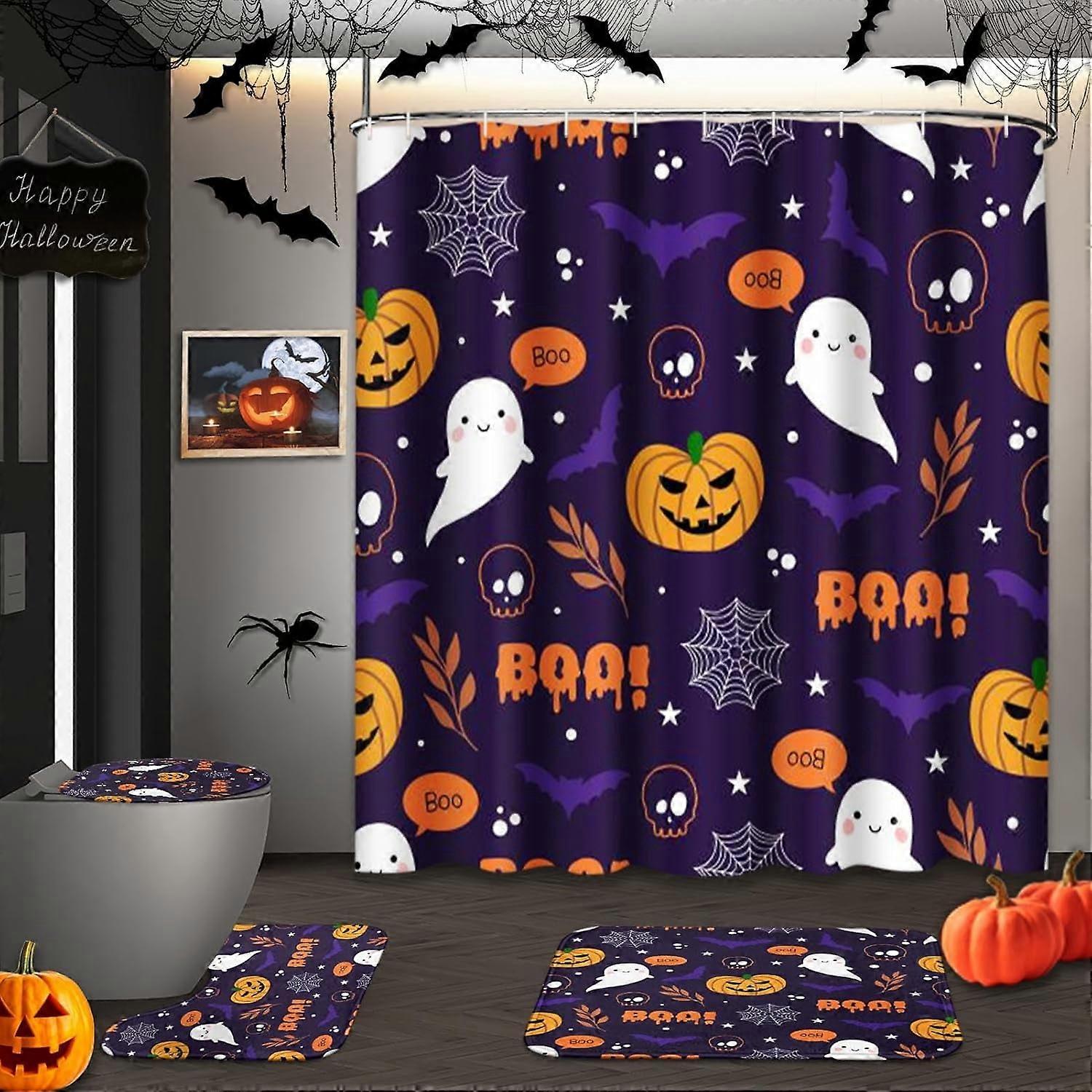 Halloween Skeleton Shower Curtain Set with Toilet Lid Cover & Non-Slip Rugs, 4 Pcs Autumn Orange Skull Bath Curtains, Cute Evil Horror Bathroom Decor