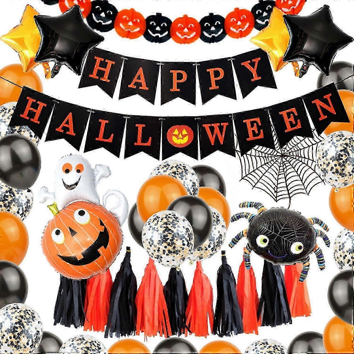 Halloween Balloon Decorations Set Halloween Party Supplies Happy Halloween Banner Pumpkin Spider Pattern Foil Latex Balloons for Kids Halloween Theme