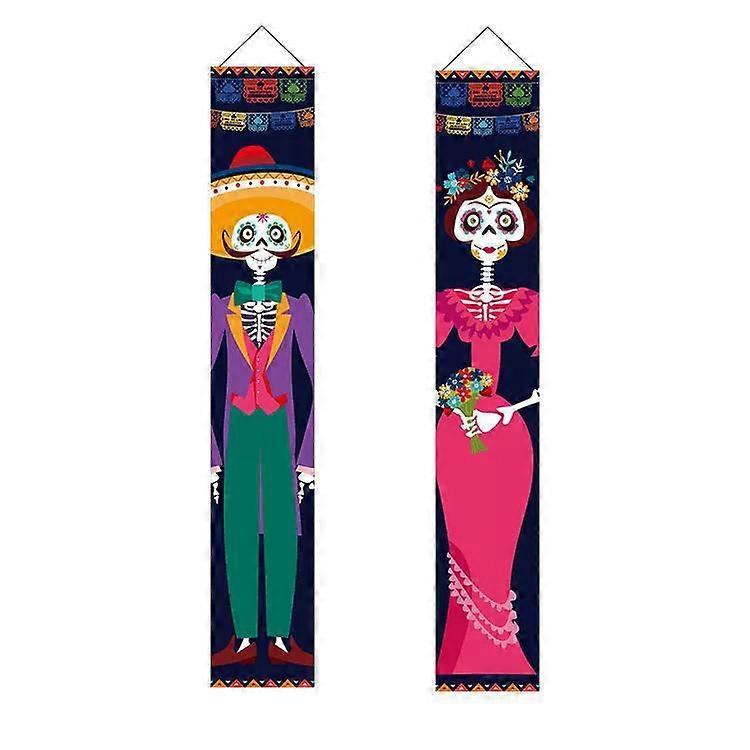 Made Material: The Day of The Dead Porch Sign Porch Hanging Banner Porch Sign is High quality Polyester cloth UV / fade-resistant, reusable and durable porch sign hanging banner. Eco-Friendly no bad smell and Sturdy enough to use. There are wooden rods on the and bottom to increase the weight of the banner. So you can hang them in designated places easily.if you have any questions pls tell us,we garantee try our best service for you! The autumn Mexico welcome door hanging Banner Porch Sign perfect for your HALLOWEEN Welcome Party.you can use it in front door, indoor and outdoor, living room, bedroom,yard and anywhere as you like. Perfect for your party Decorations! Design style: with skulls and flowers can add more colors and stronger festival elements to the day of the dead, staying in the surroundings, you can better pray for the deceased! Packaging : 1 piece ghost bride banner, 1 piece groom groom banner. there is stable hanging rope to hang. the size of the ghost bride and groom fall banners measures about 72 inchx12 inch.